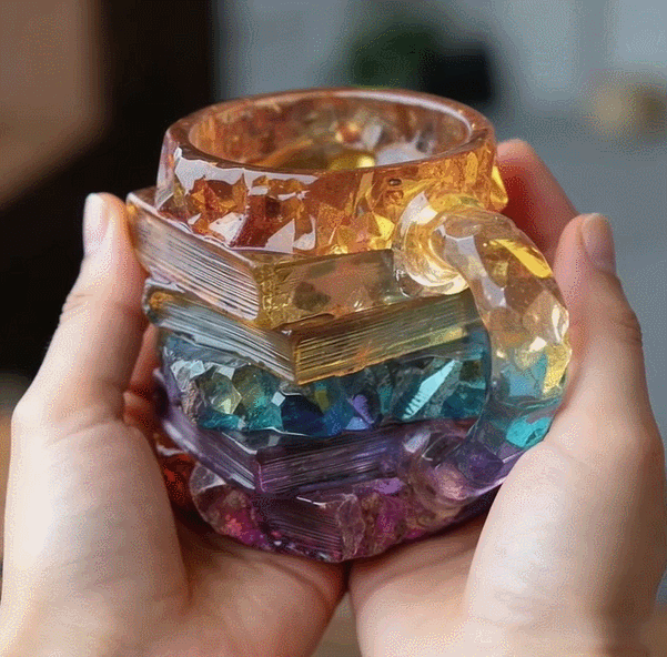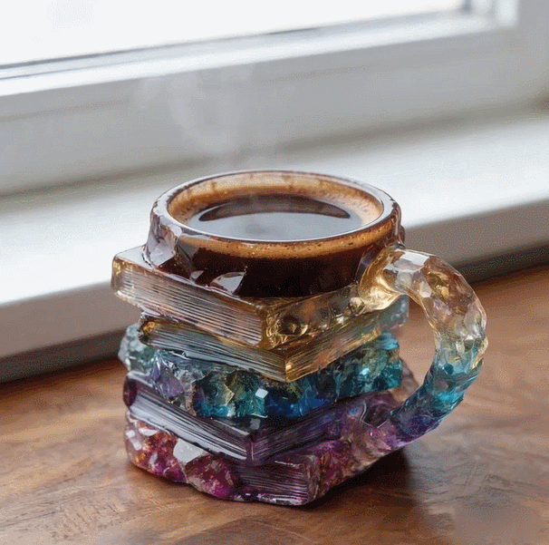 Inspired by a stack of well-loved books, the mug features an irregular, layered design that looks as if it were carved from glowing crystal. Each “book” is detailed with textured page edges and faceted surfaces, creating depth, dimension, and a sense of artistry from every angle.